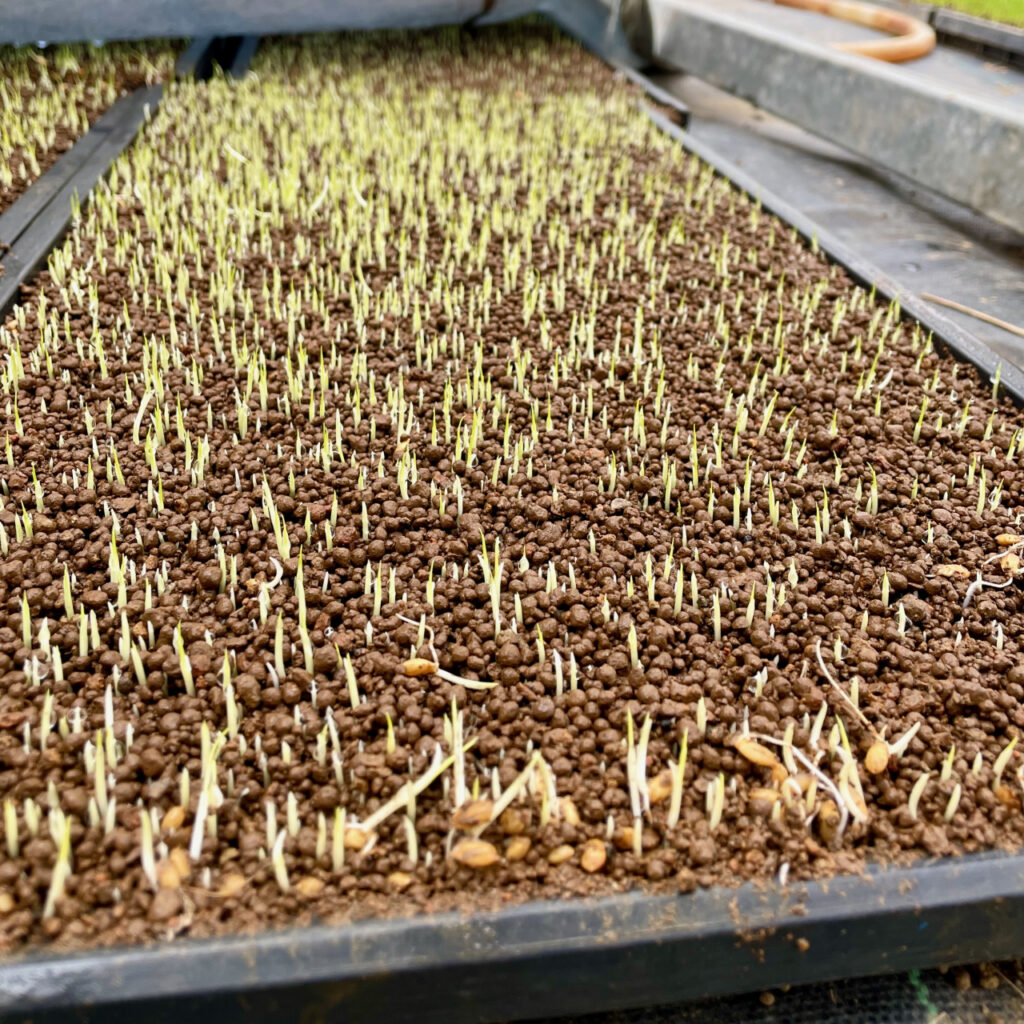芽を出し始めた種は均一に育苗箱にまかれ、薄く土をかぶりこれからの成長を楽しみにビニールハウスの中で眠る。時に冷たい谷水を浴びながら自然の厳しさに慣れ少しずつ芽が顔を出す。