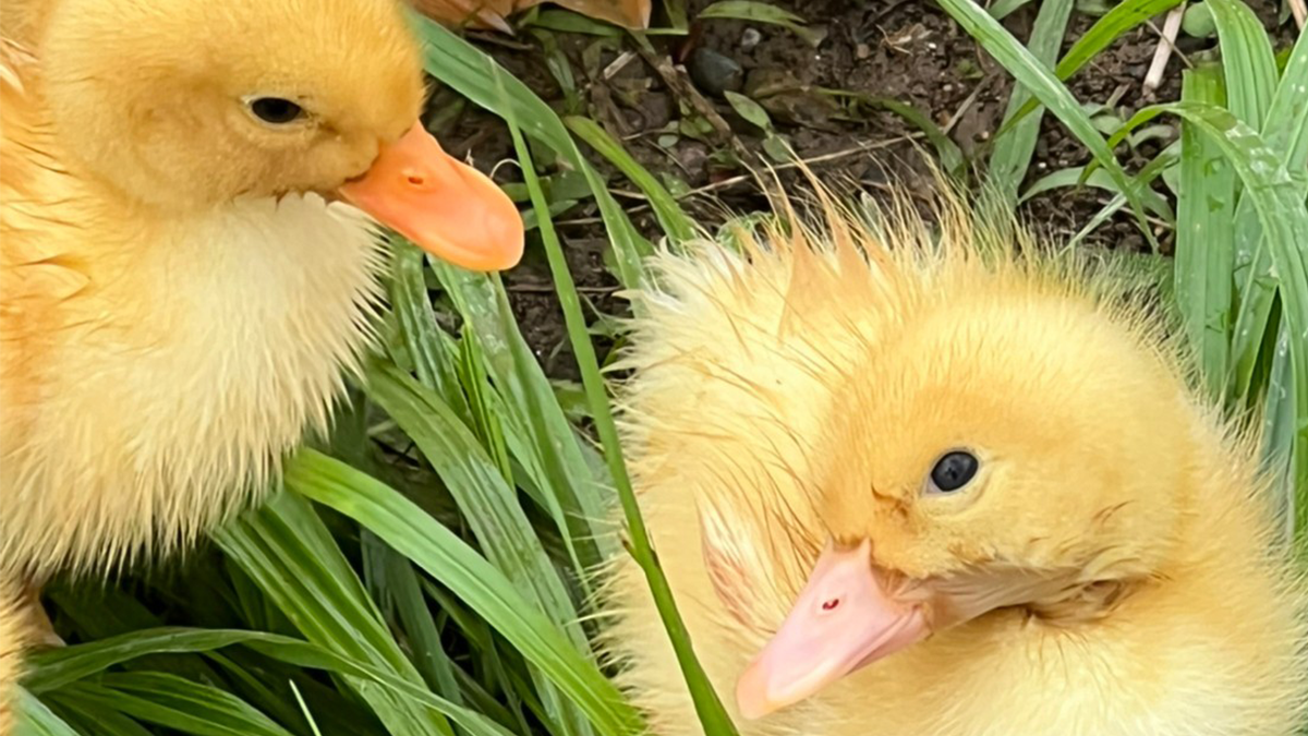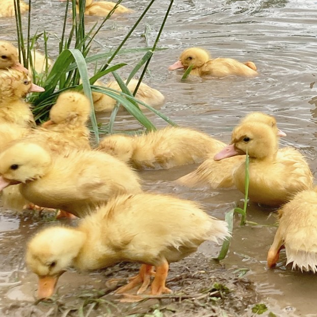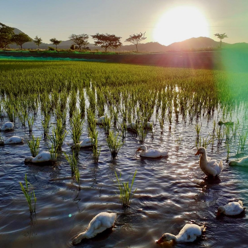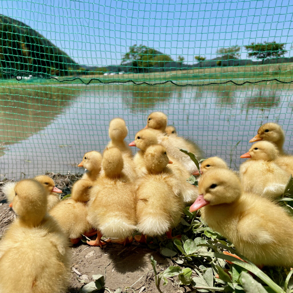 田植えから約1〜2週間後、田んぼに新入生のアイガモがたくさんやってくる。虫を追いかけ、雑草を食べ、土をかき混ぜながら稲の成長を手本にすくすくと大きくなる。